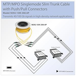 Diseñado para el interconexión de fibra óptica de alta densidad entre los bastidores de distribución principales (MDF) y los bastidores de distribución intermedios (IDF) de los centros de datos, el cable troncal delgado monomodo MTP/MPO N392-15M-3X8-AP de Tripp Lite garantiza un rendimiento óptimo en toda su red de área local. Con tres conectores hembra MTP/MPO en cada extremo, este cable de 15 metros con clasificación 8.3/125 admite velocidades Ethernet de 40/100 Gb y está optimizado para redes QSFP+ 40GBASE-PLR4 y QSFP28 100GBASE-PSM4. Además, cuenta con una cubierta doble de 6 mm con clasificación plenum y fibra insensible a la flexión, por lo que resulta ideal para conectar componentes de red de alta velocidad a través de techos, paredes y conductos.